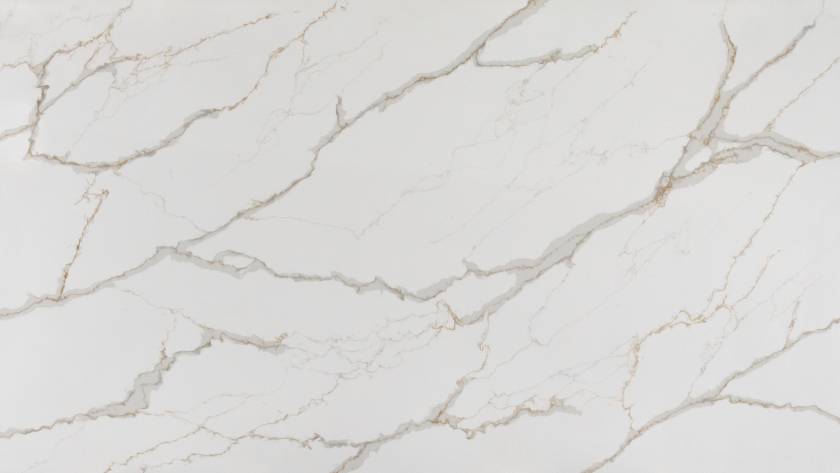 This new surface is sure to add a rich texture to any room. Majestic gold accents complement the light gray veining on this soft white background.