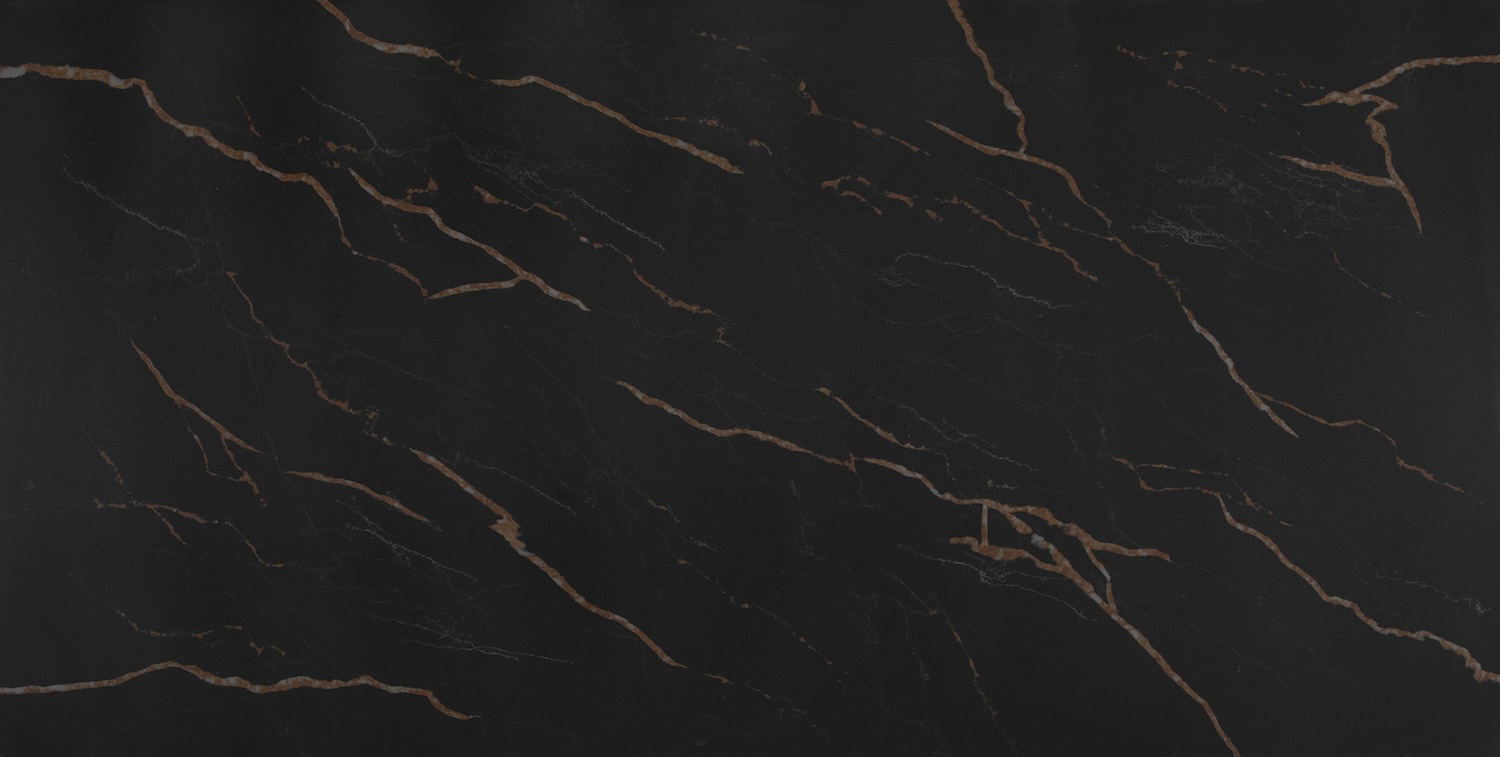Laurence Gold unveils delicate, sinuous veins enriched with glistening gold-toned metallic inlays. It takes inspiration from the dynamic dance of molten gold streams that leave their mark on volcanic terrain, capturing the essence of a serene, candlelit golden flame that delicately accentuates tiny metallic fragments.